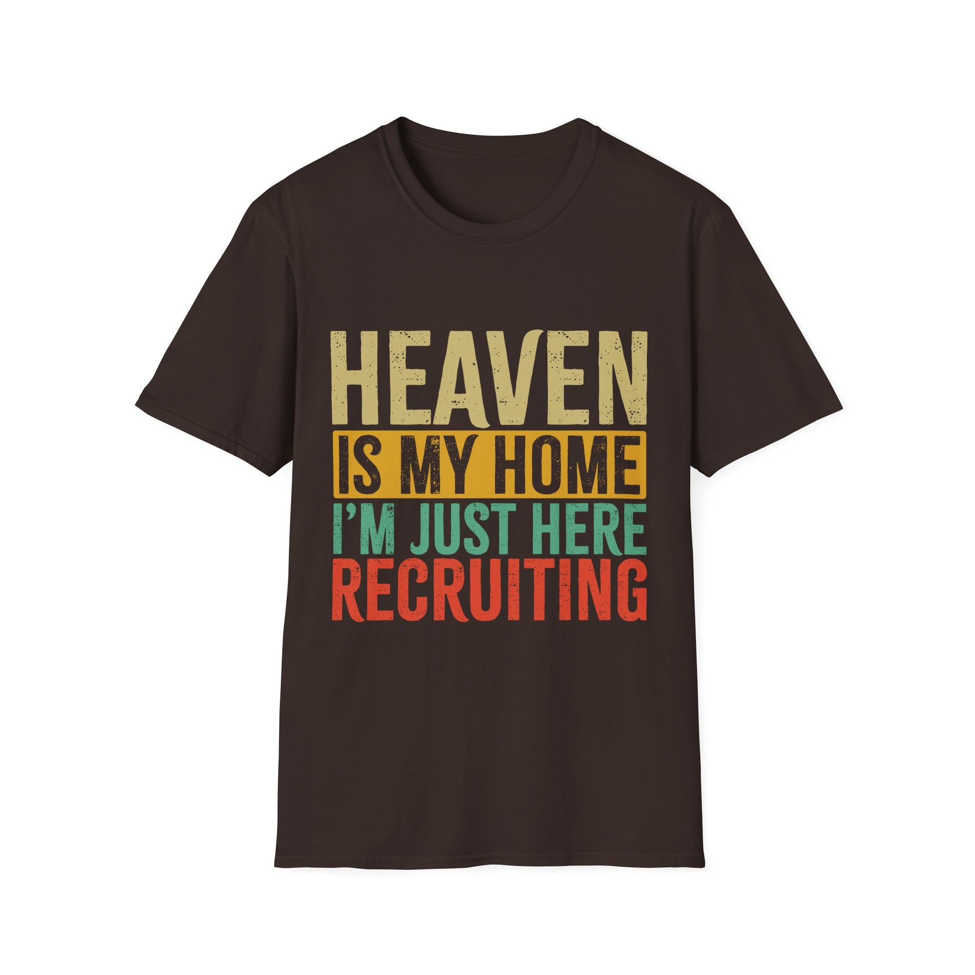 You're not just passing through—you're on a mission. Our "Heaven is My Home I'm Just Here Recruiting" Christian t-shirt boldly declares that this world isn't your final destination and you're actively working to bring others with you. This evangelistic faith-based apparel is perfect for believers who take the Great Commission seriously.